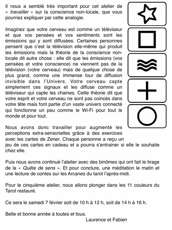 Dans un premier temps, Laurence a remis à chaque personne sa carte de naissance, d’après le Tarot de l’Énergie de Jean-Louis Abrassart.