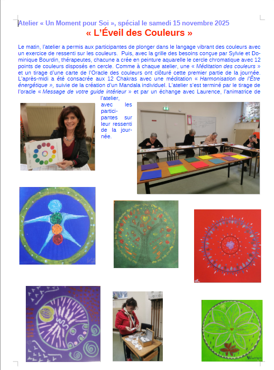 Le prochain atelier a lieu le samedi 18 mai 2024 de 10 h à 12 h, Laurence propose de réaliser un Mandala à partir de la numérologie, aussi il est important de vous inscrire préalablement : laurence.jacquot54@orange.fr ou par sms au 06 20 14 13 59