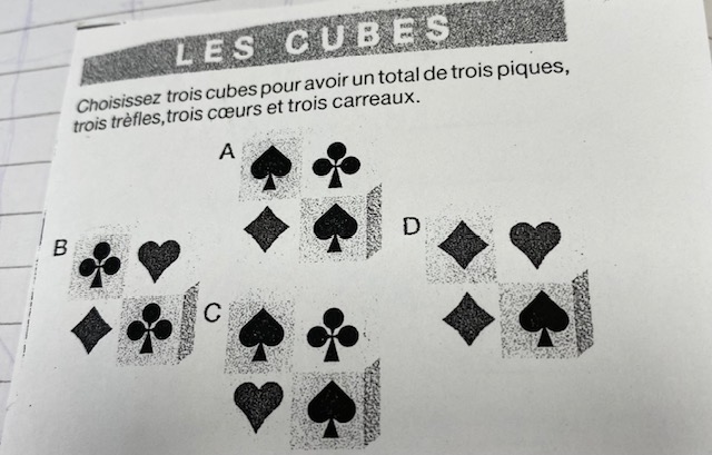 Nous passons aux « exercices » : Un jeu de mémoire, après avoir étudié une photo que nous cachons, nous devons indiquer les objets qui s’y trouvaient ; Nous nous en sortons pas mal ;