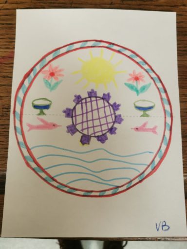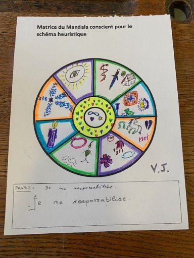 Tout cela a donné lieu à de riches échanges et bien sûr, la réalisation d’un Mandala individuel. Une expérience intéressante qui a permis d’être à l’écoute de l’intuition et de laisser librement arriver les mots qui parlent à notre être profond.