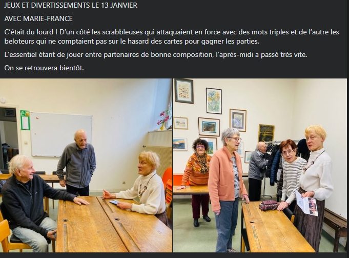 Excellente séance de JEUX avec une ambiance survoltée du côté des joueurs de belote tandis que les scrabbleuses se faisaient plus discrètes mais tout aussi compétitives. L’ambiance s’est prolongée par des échanges hilarants et nombre de bavardages .